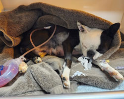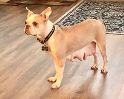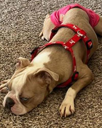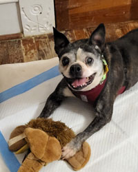 Kahlua - December 2022 - 4 year old female from Mikey's Chance Canine Rescue Kahlua, only 13 pounds, was surrendered to Mikey’s Chance after being in active labor after two days of pushing and no progress. She was rushed into the ER for a C-section. She had four live births and one that passed. Kahlua has had multiple setbacks. Since then, she has had three additional surgeries. The latest was for peritonitis. Kalua has a new light in her eyes and a huge will to fight to live. Kahlua survived her long battle and was adopted by her loving vet tech. She now lives in Kennewick, Washington.